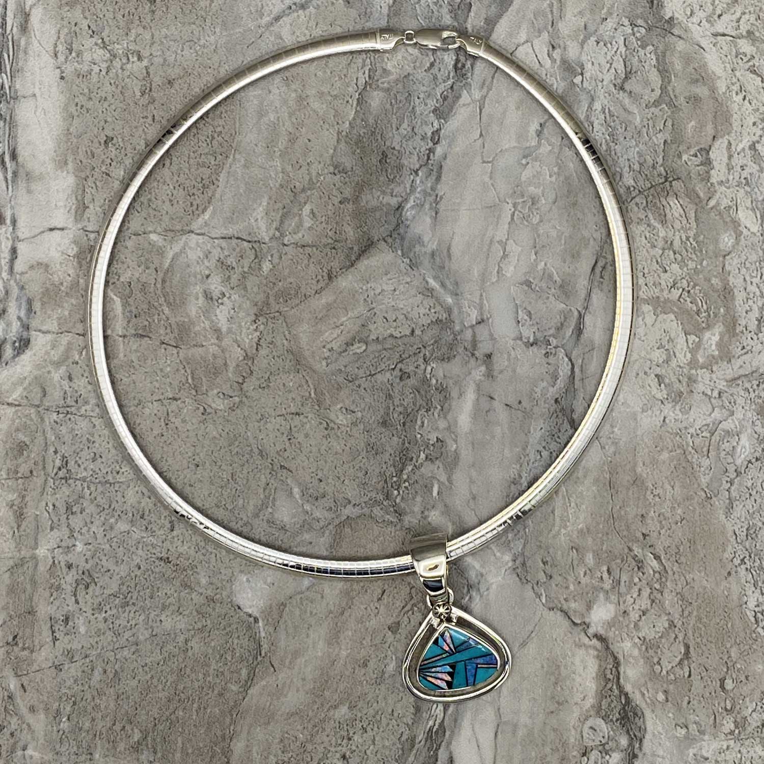 This striking necklace is a beautiful blend of traditional Southwestern materials and contemporary design, featuring precision inlay work by a Navajo artist, signed MLB.