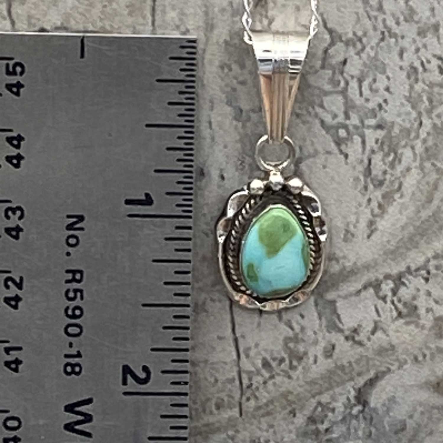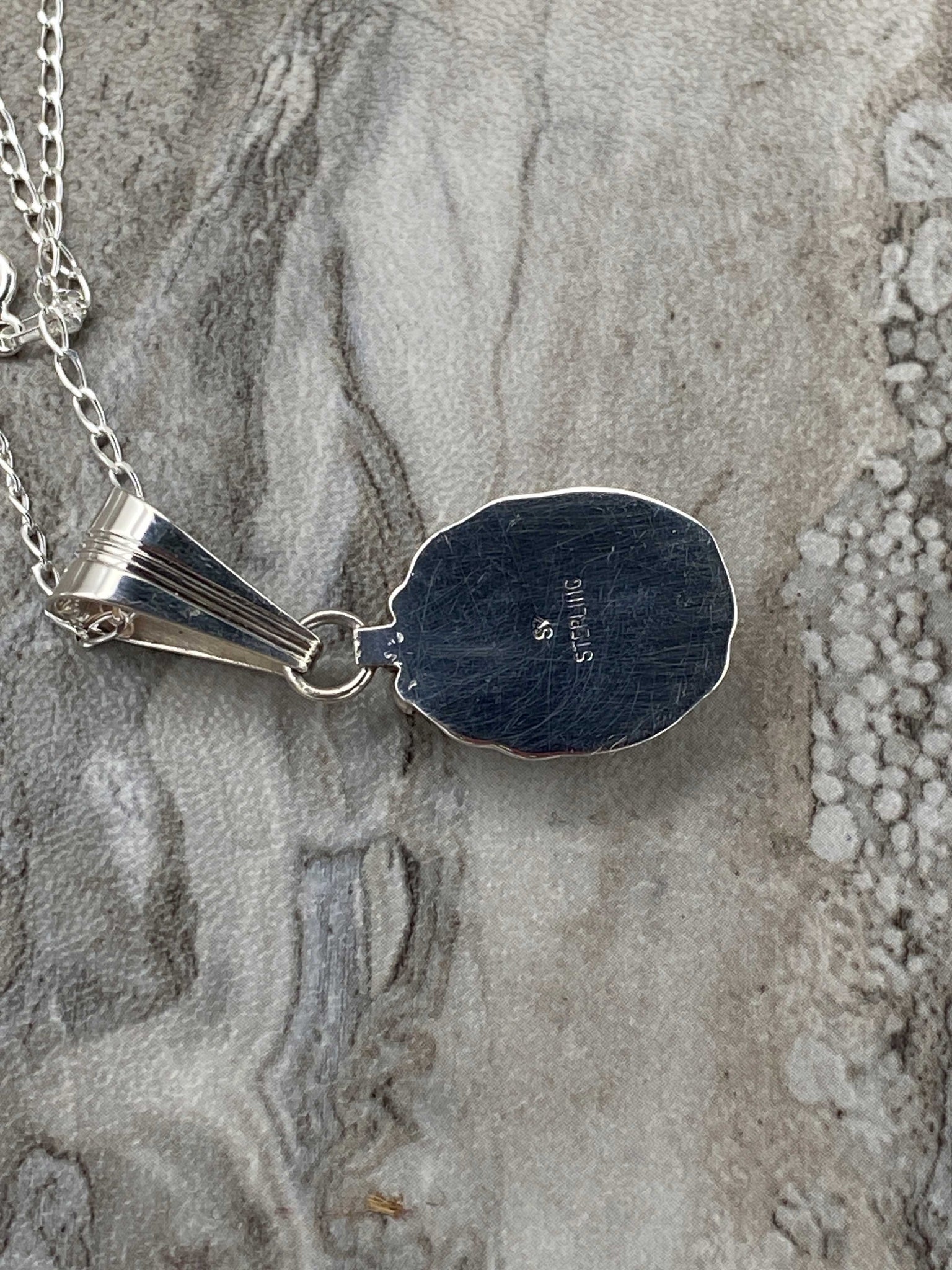 - The reverse of the pendant is marked "SV" along with "STERLING", indicating it was crafted by a Navajo silversmith.