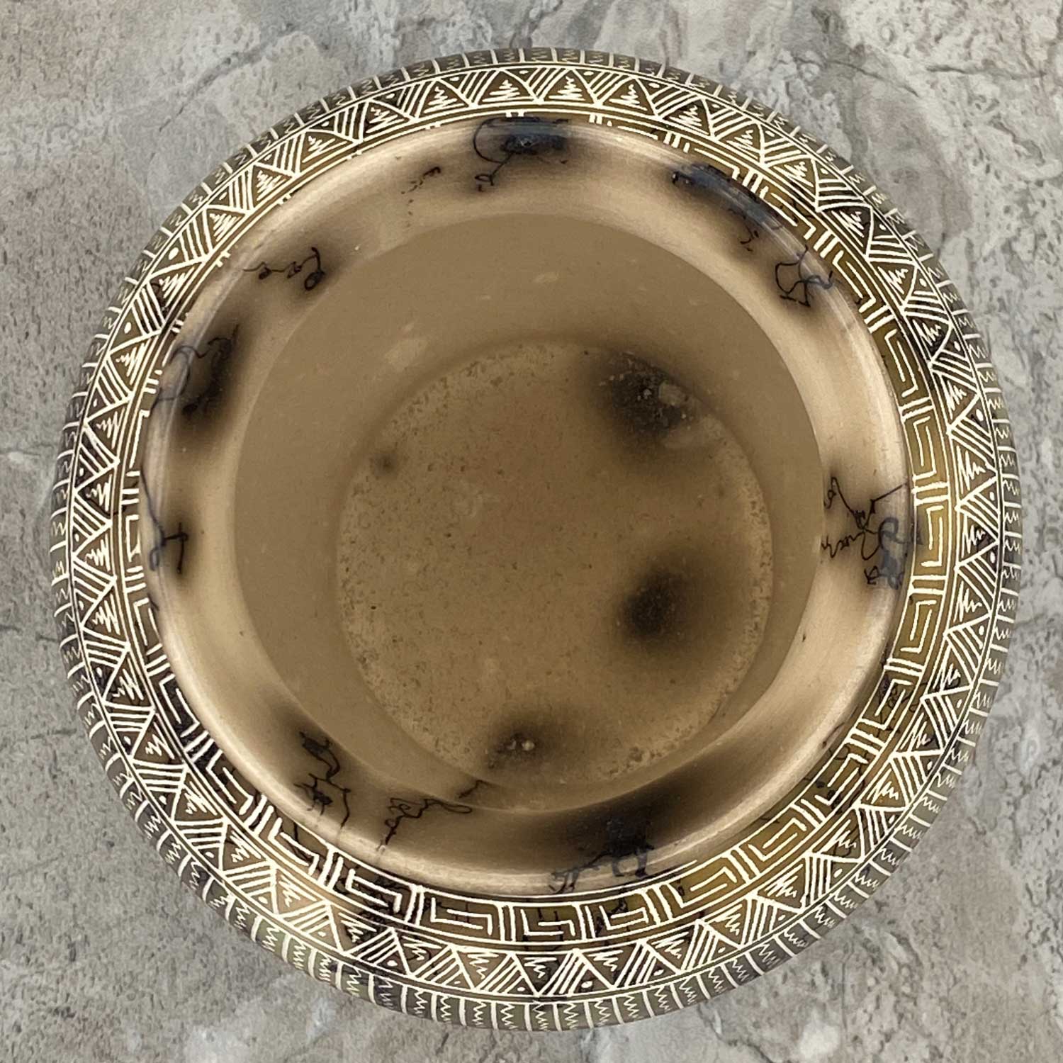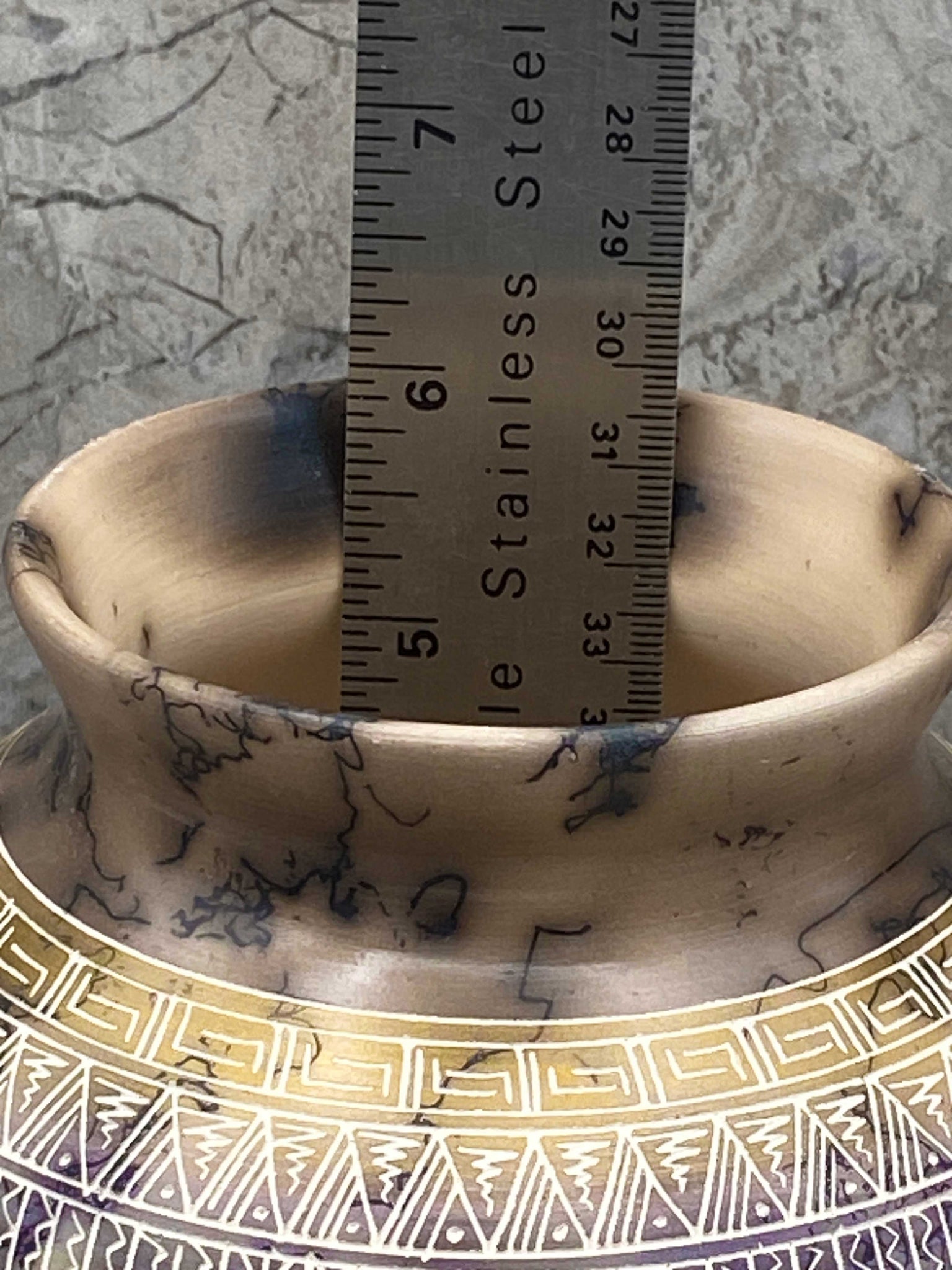 The rim, neck, and base showcase the organic, mesmerizing black lines characteristic of the horsehair technique. This is achieved by placing strands of horsehair on the pottery while it's still hot from the kiln, creating unique, natural smoke and carbon trails (no two are alike!).